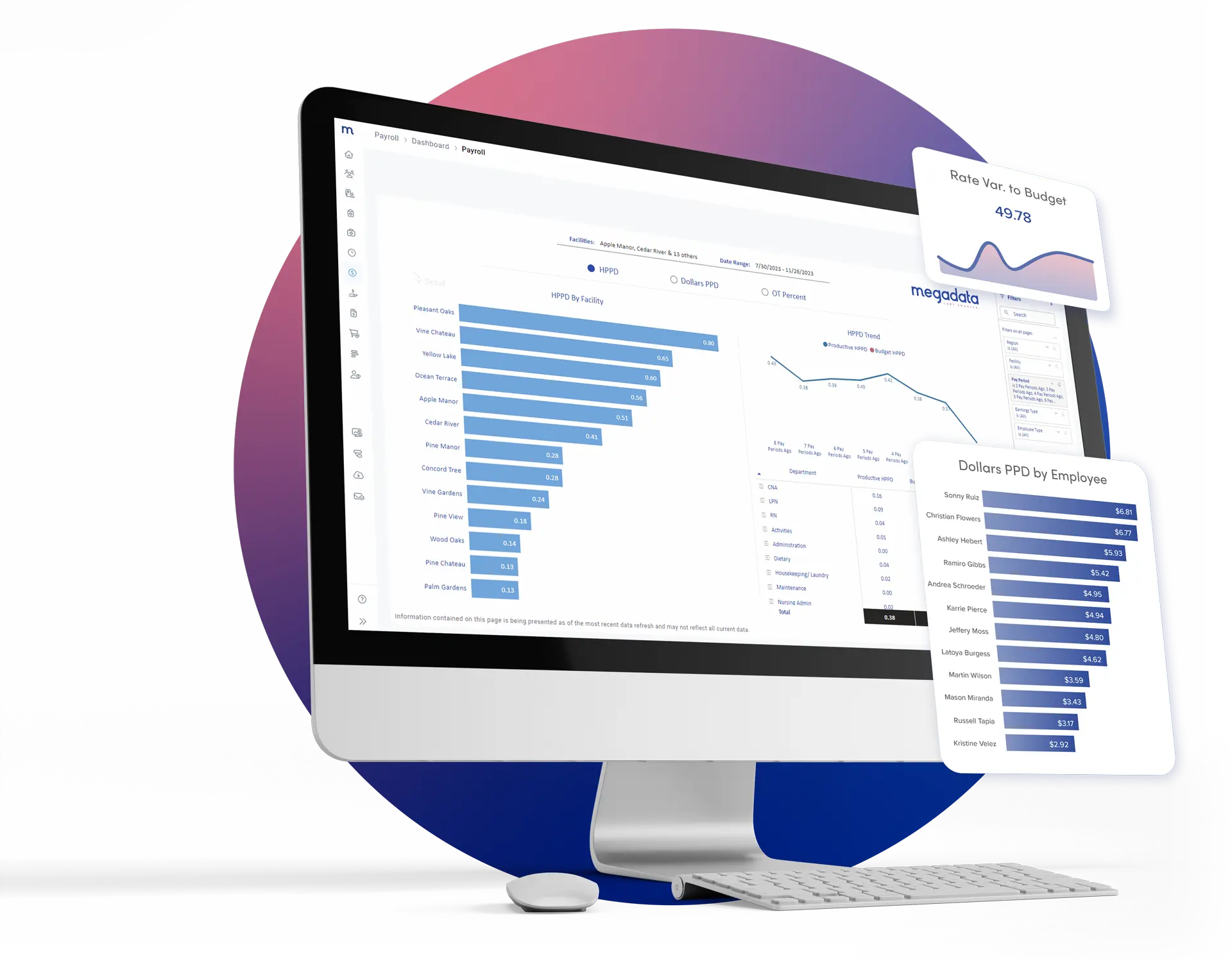 None of these dashboards or reports work unless your payroll/time systems and staffing systems feed into them in close to real time. That’s why Megadata supports deep integrations with virtually all major SNF payroll / HR / time systems, including: